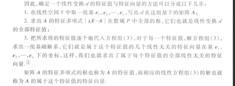 记是在基向量下的坐标由知 第二行是一个齐次线性方程组(即下图中提到的方程组(3)),其有非零解的充要条件是 定义5 称式为的特征多项式,这是数域上的一个次多项式。