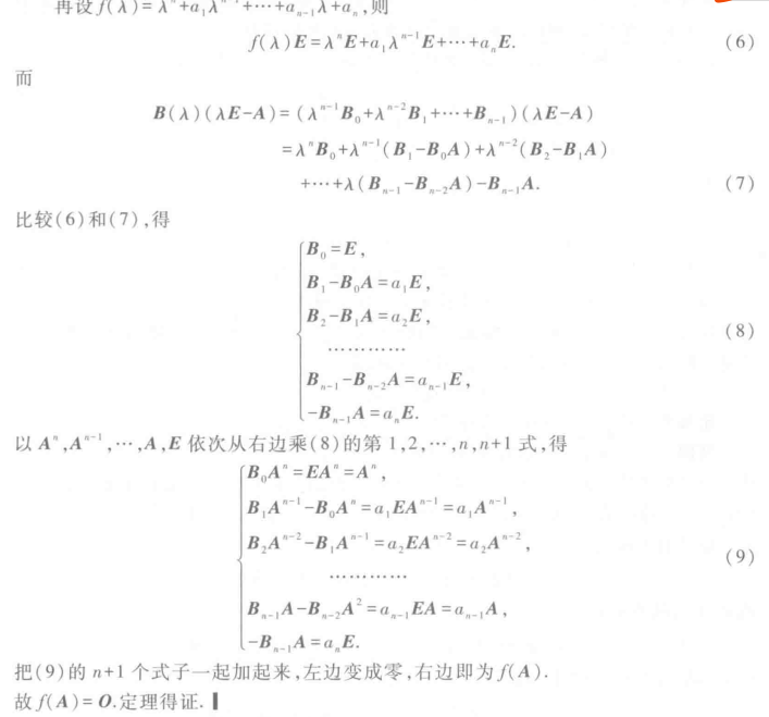 设 是数域 上的 矩阵, 是其特征多项式,则: 注项:可能有人觉得这是一个显而易见的结论,将中的替换为就可以直接得到结论。 实际上,与间的是一种数乘关系,故这里的,且如果是那样的话,得到的应该是而这里得到的是零矩阵。因此,将中的替换为是很容易引发歧义的,更好的做法是先展开成多项式的形式,再替换,如上式。 现阶段,这个定理的证明一般要用到伴随矩阵的运算性质 证明: