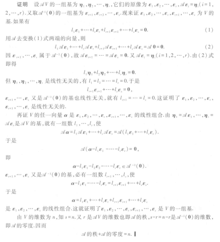 的秩和的秩是保持一致的,且接下来我们证明 定理10 设 是 维线性空间 的线性变换,则 的一组基的原像及 的一组基合起来就是 的一组基。由此还有